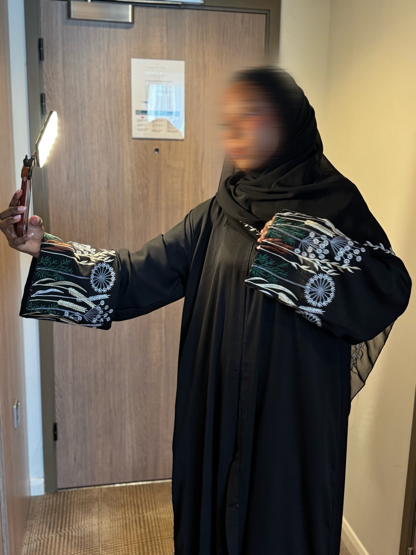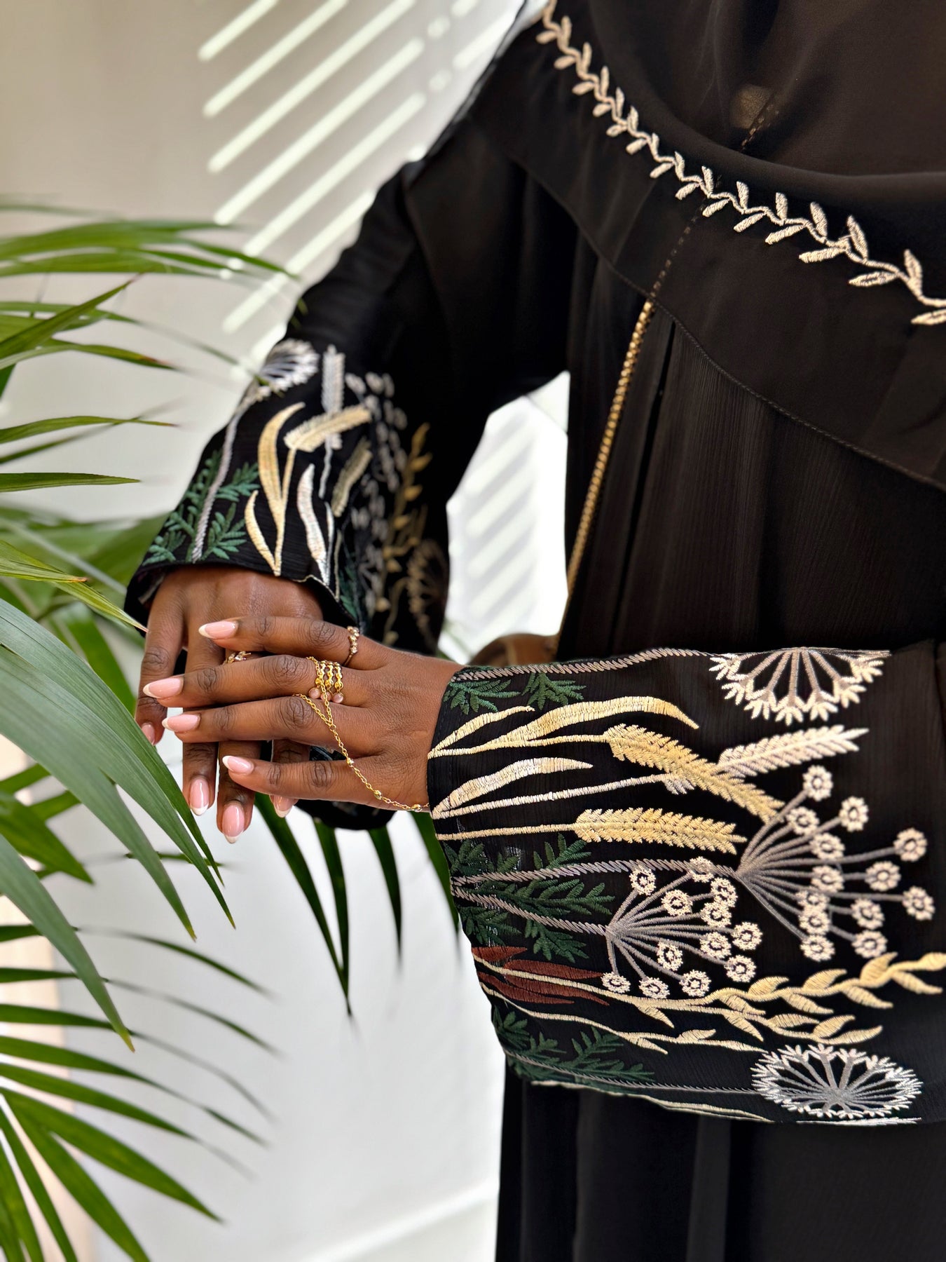 To maintain the integrity and beauty of the embroidered abaya, we recommend professional dry cleaning. If washing at home, hand wash in lukewarm water, separately from other items, at a low temperature. Avoid tumble drying to ensure the longevity of the fabric and embroidery.