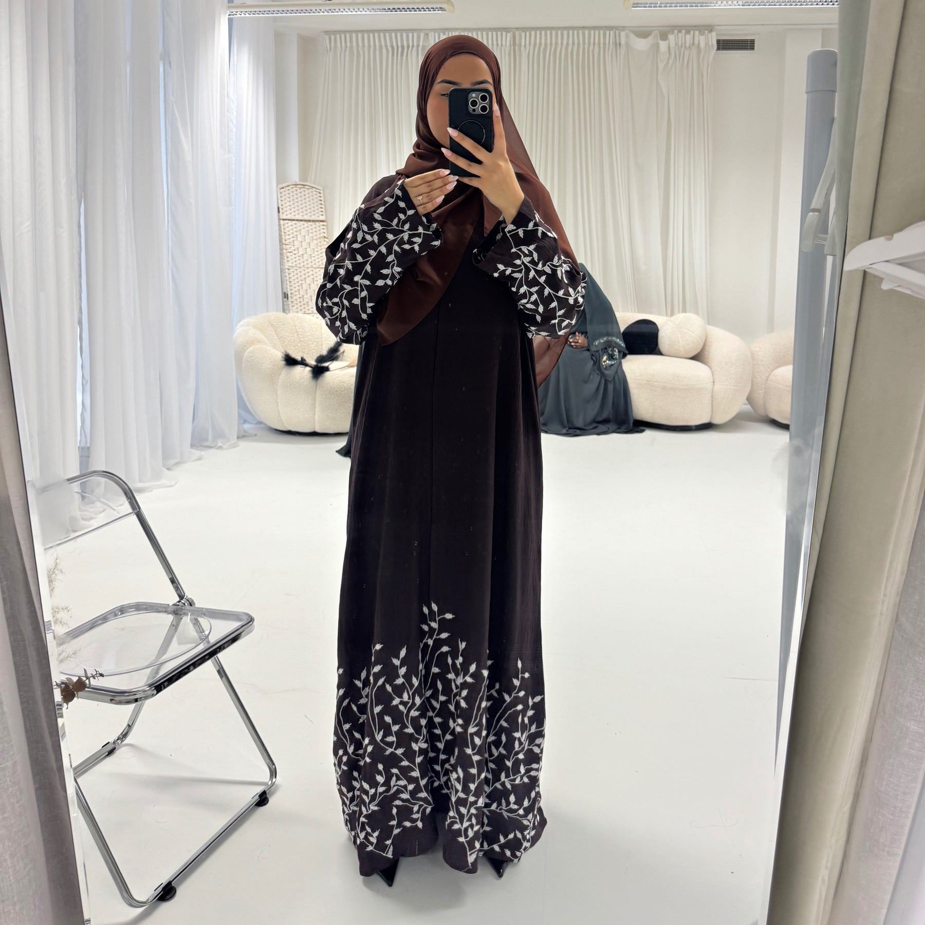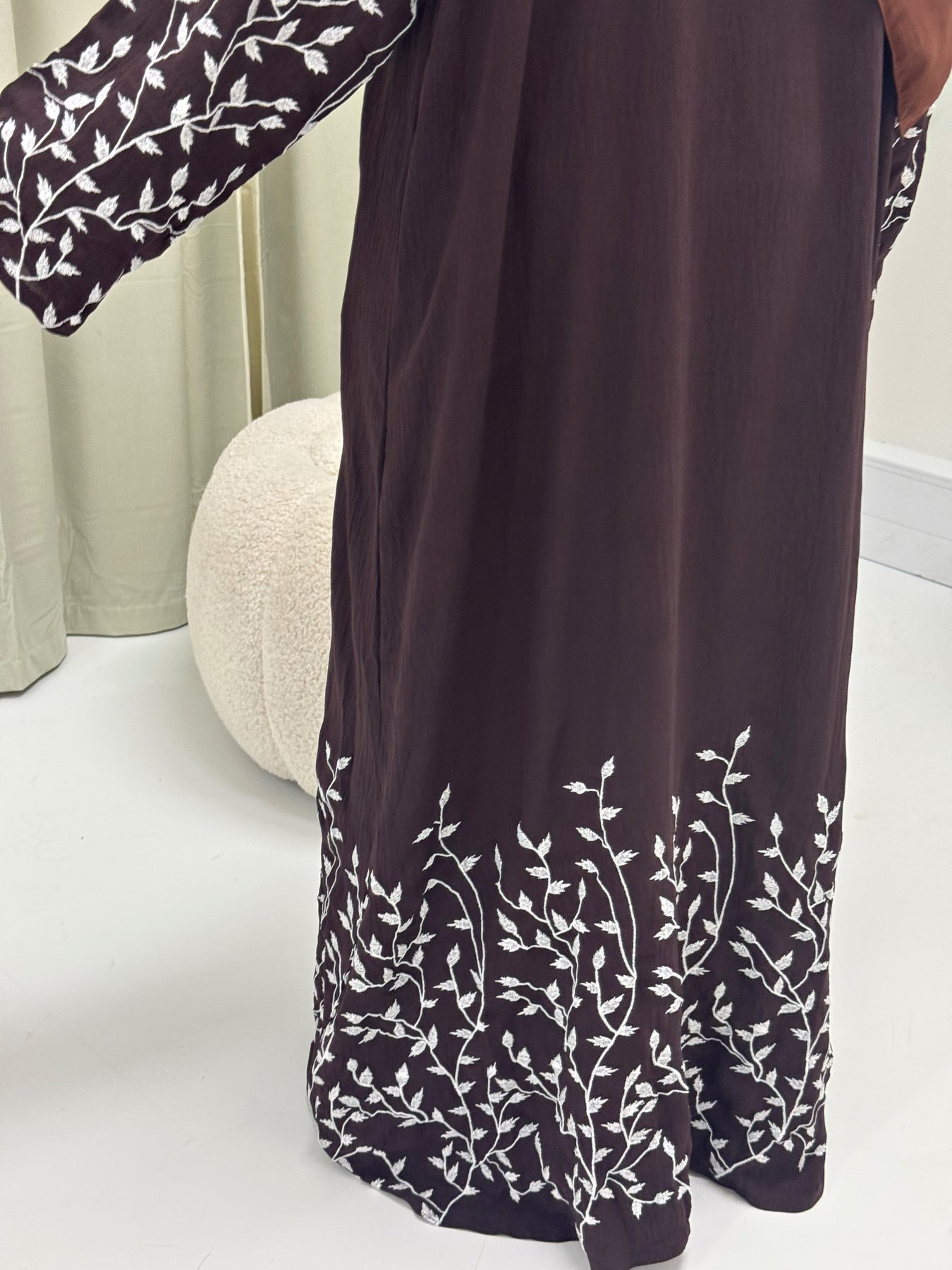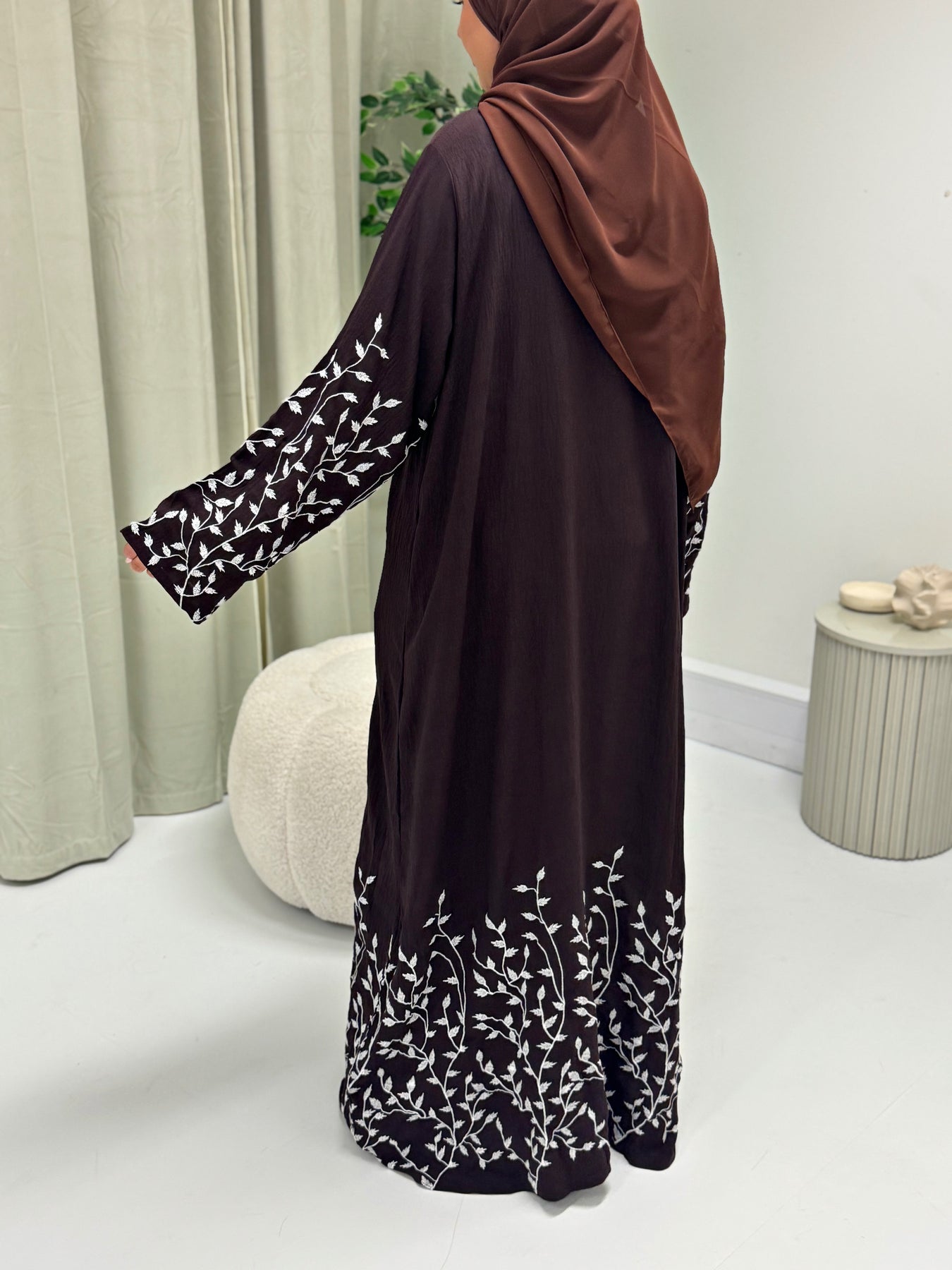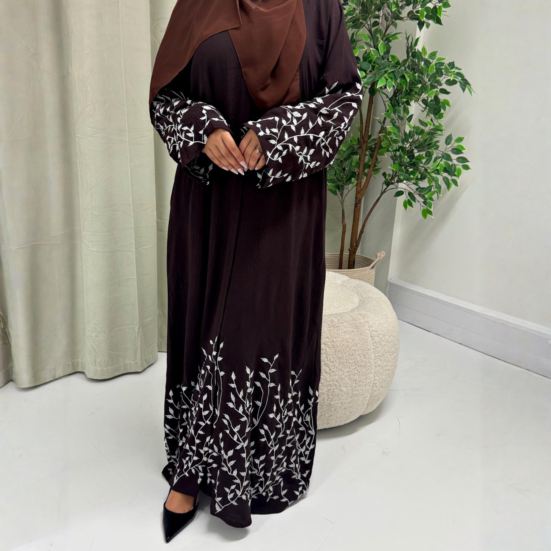 A lovely taupe coloured, embroidered open abaya made to suit all shapes and sizes. The pretty floral embroidery work all over this abaya makes it an absolutely gorgeous piece for those special occasions! Can be worn closed too as it has pop buttons all the way down the front.